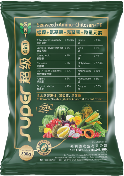 4 in1 EDTA 微量营养素微量元素是一种综合营养增强剂,适用于所有类型的农作物,尤其是其平衡成分的 EDTA 螯合作用有助于最大限度地减少养分相互作用问题并避免养分抗衡竞争。 100%全水溶性产品由海藻、氨基酸、壳聚素及7种微量元素组成,可防止因营养失衡而造成的植物营养缺乏和作物损害。此产品稳定及安全,在农业种植中如:水培系统、灌溉系统或叶面喷雾都皆适用。