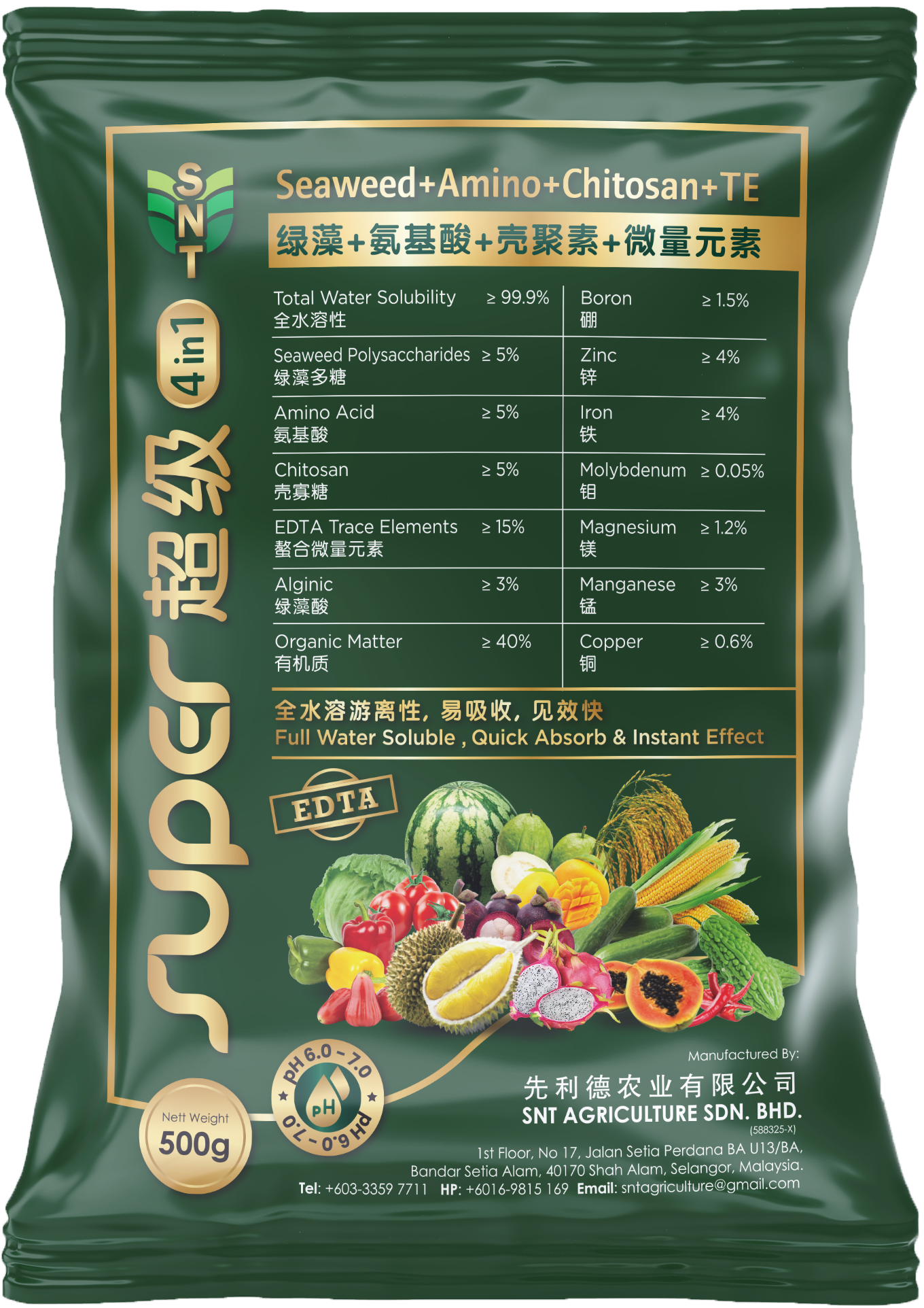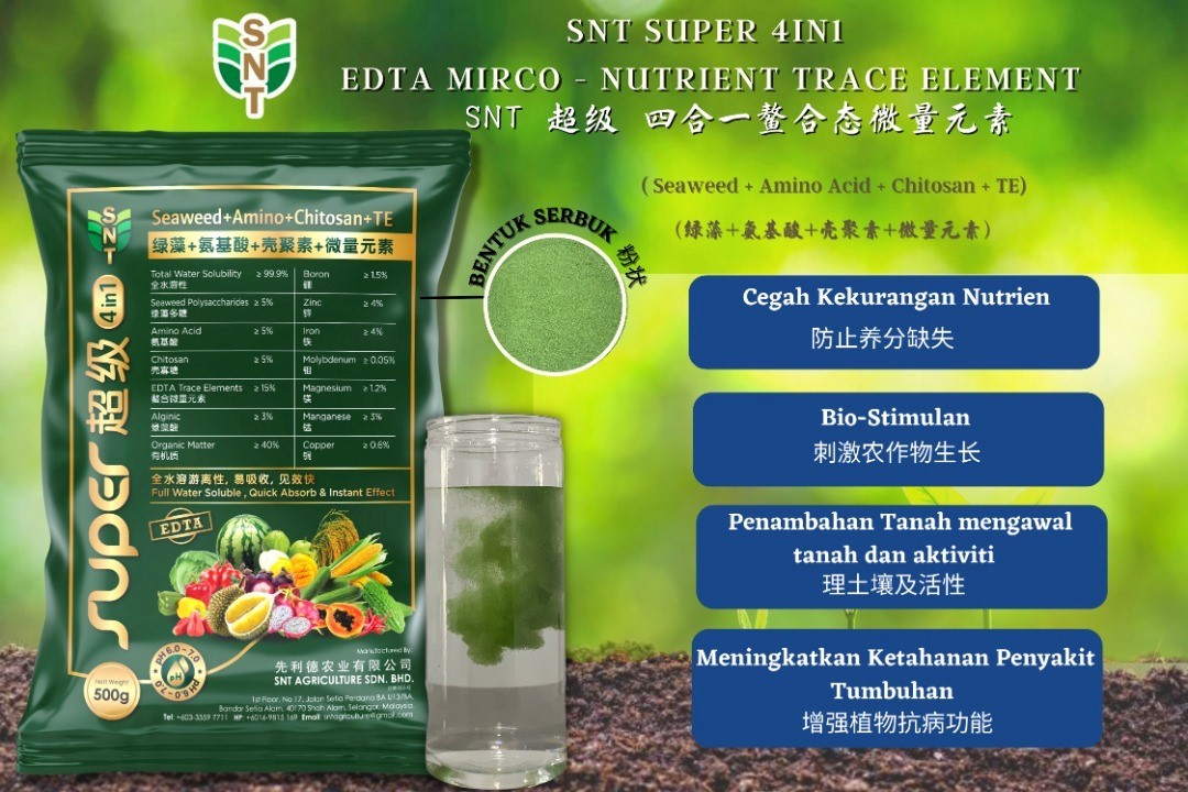4 in1 EDTA 微量营养素微量元素是一种综合营养增强剂,适用于所有类型的农作物,尤其是其平衡成分的 EDTA 螯合作用有助于最大限度地减少养分相互作用问题并避免养分抗衡竞争。 100%全水溶性产品由海藻、氨基酸、壳聚素及7种微量元素组成,可防止因营养失衡而造成的植物营养缺乏和作物损害。此产品稳定及安全,在农业种植中如:水培系统、灌溉系统或叶面喷雾都皆适用。